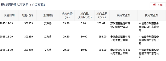 11月19日,艾布鲁大宗交易成交26.8万股,成交额798.64万元,占当日总成交额的3.35%,成交价29.8元,较市场收盘价33.47元折价10.97%。