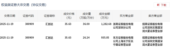 11月19日,汇创达大宗交易成交62.24万股,成交额2217.73万元,占当日总成交额的5.89%,成交价35.63元,较市场收盘价41.99元折价15.15%。