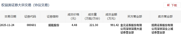 11月24日,韶能股份大宗交易成交221.3万股,成交额991.42万元,占当日总成交额的8.19%,成交价4.48元,较市场收盘价4.91元折价8.76%。