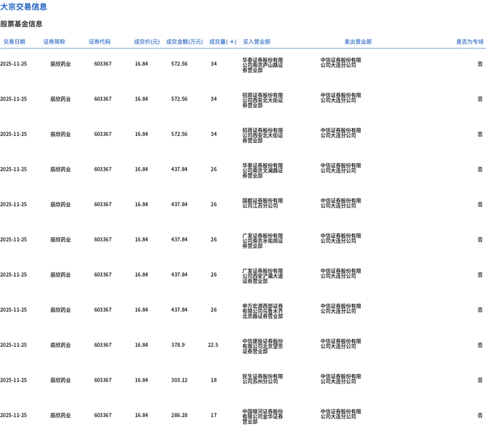 11月25日,辰欣药业大宗交易成交376.5万股,成交额6340.26万元,占当日总成交额的18.78%,成交价16.84元,较市场收盘价18.88元折价10.81%。
