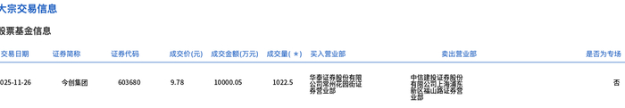 11月26日,今创集团大宗交易成交1022.5万股,成交额1亿元,占当日总成交额的36.3%,成交价9.78元,较市场收盘价11.12元折价12.05%。