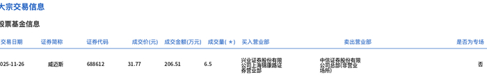11月26日,威迈斯大宗交易成交6.5万股,成交额206.51万元,占当日总成交额的3.92%,成交价31.77元,较市场收盘价31.77元持平。