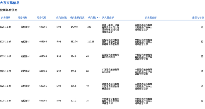 11月27日,宏柏新材大宗交易成交550.26万股,成交额3257.54万元,占当日总成交额的11.16%,成交价5.92元,较市场收盘价7.23元折价18.12%。