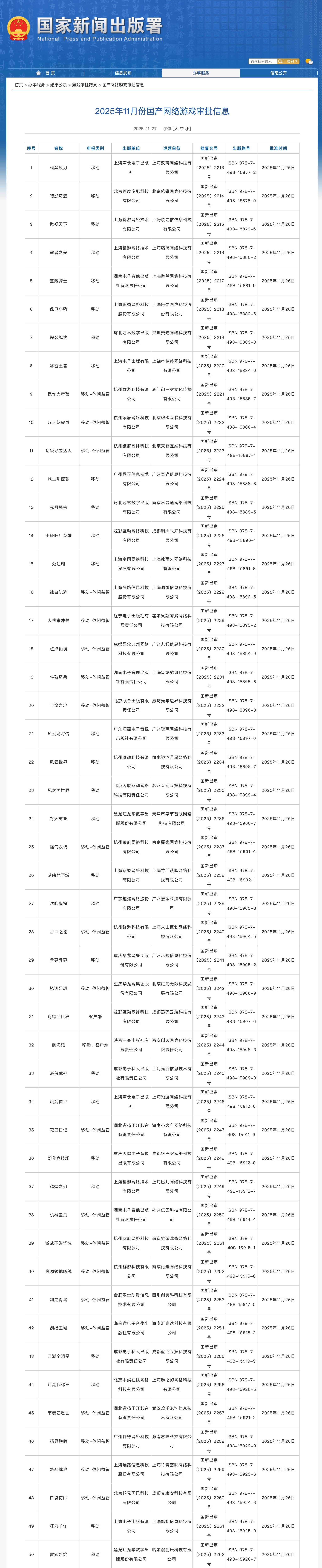 11月27日,界面新闻获悉,国家新闻出版署公布了2025年11月的网络游戏版号审批信息。本批次共有178款国产网络游戏和6款进口游戏获批,版号数量创下近几年新高,表明游戏行业呈现出积极向好的发展态势。