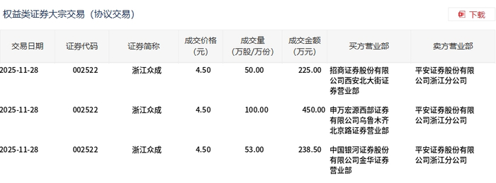 11月28日,浙江众成大宗交易成交203万股,成交额913.5万元,占当日总成交额的8.85%,成交价4.5元,较市场收盘价5.04元折价10.71%。
