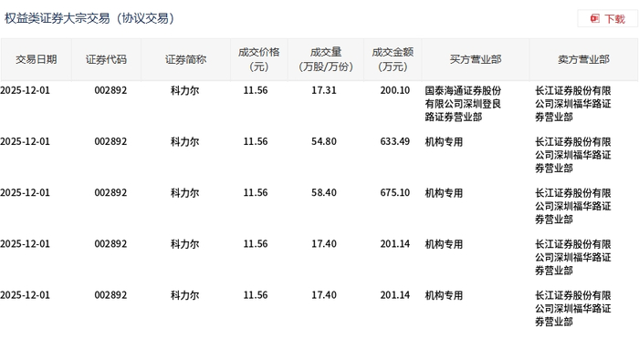 12月1日,科力尔大宗交易成交165.31万股,成交额1910.97万元,占当日总成交额的11.22%,成交价11.56元,较市场收盘价13.1元折价11.76%。