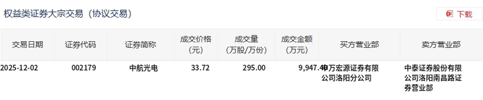 12月2日,中航光电大宗交易成交295万股,成交额9947.4万元,占当日总成交额的18.23%,成交价33.72元,较市场收盘价33.72元持平。