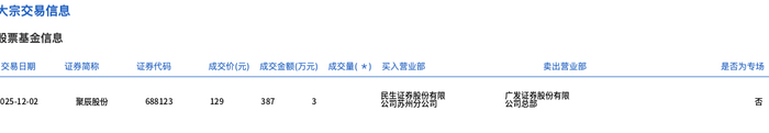 聚辰股份今日大宗交易平价成交3万股,成交额387万元