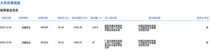 12月2日,合盛硅业大宗交易成交213.8万股,成交额1.08亿元,占当日总成交额的11.43%,成交价50.41元,较市场收盘价55.56元折价9.27%。