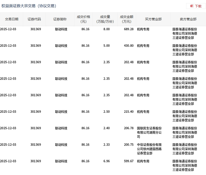 12月3日,联动科技大宗交易成交34.24万股,成交额2950.12万元,占当日总成交额的13.5%,成交价86.16元,较市场收盘价108.64元折价20.69%。