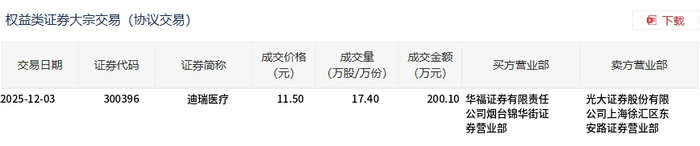 12月3日,迪瑞医疗大宗交易成交17.4万股,成交额200.1万元,占当日总成交额的6.62%,成交价11.5元,较市场收盘价13.49元折价14.75%。