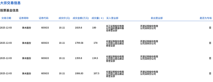 12月3日,徕木股份大宗交易成交600万股,成交额6066.01万元,占当日总成交额的32.52%,成交价10.11元,较市场收盘价10.97元折价7.84%。