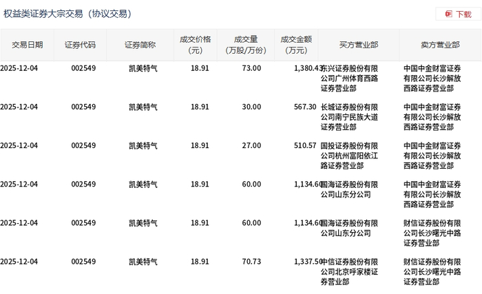 12月4日,凯美特气大宗交易成交320.73万股,成交额6065万元,占当日总成交额的5.28%,成交价18.91元,较市场收盘价20.23元折价6.52%。