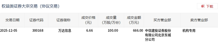 12月5日,万达信息大宗交易成交100万股,成交额666万元,占当日总成交额的7.57%,成交价6.66元,较市场收盘价6.69元折价0.45%。
