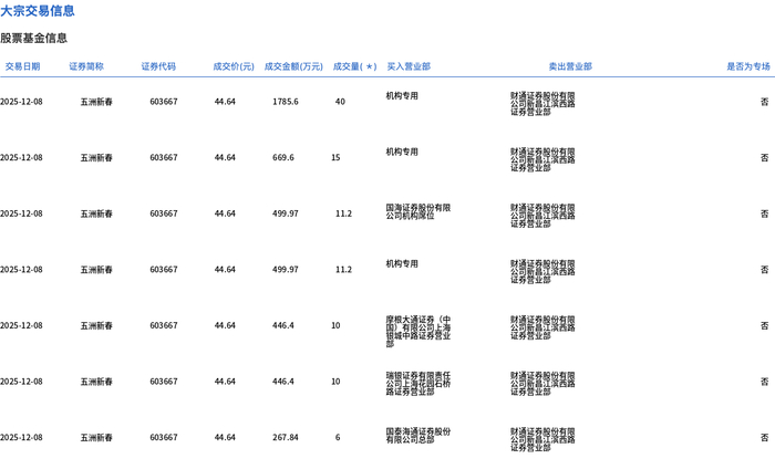 12月8日,五洲新春大宗交易成交117.53万股,成交额5246.54万元,占当日总成交额的1.63%,成交价44.64元,较市场收盘价53.97元折价17.29%。