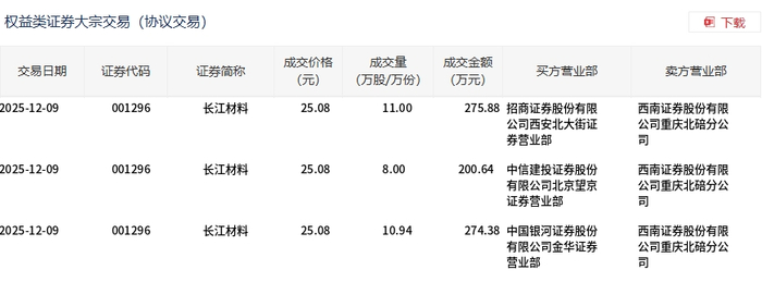 12月9日,长江材料大宗交易成交29.94万股,成交额750.9万元,占当日总成交额的3.2%,成交价25.08元,较市场收盘价26.97元折价7.01%。