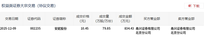 12月9日,安妮股份大宗交易成交79.85万股,成交额834.43万元,占当日总成交额的18.63%,成交价10.45元,较市场收盘价11.24元折价7.03%。