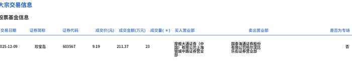 12月9日,珍宝岛大宗交易成交23万股,成交额211.37万元,占当日总成交额的4.81%,成交价9.19元,较市场收盘价10.09元折价8.92%。