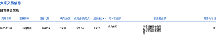 12月9日,科捷智能大宗交易成交25.22万股,成交额388.14万元,占当日总成交额的10.17%,成交价15.39元,较市场收盘价17.48元折价11.96%。