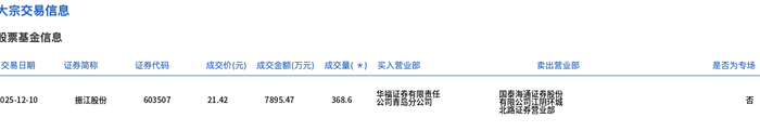 12月10日,振江股份大宗交易成交368.6万股,成交额7895.47万元,占当日总成交额的44.15%,成交价21.42元,较市场收盘价23.66元折价9.47%。