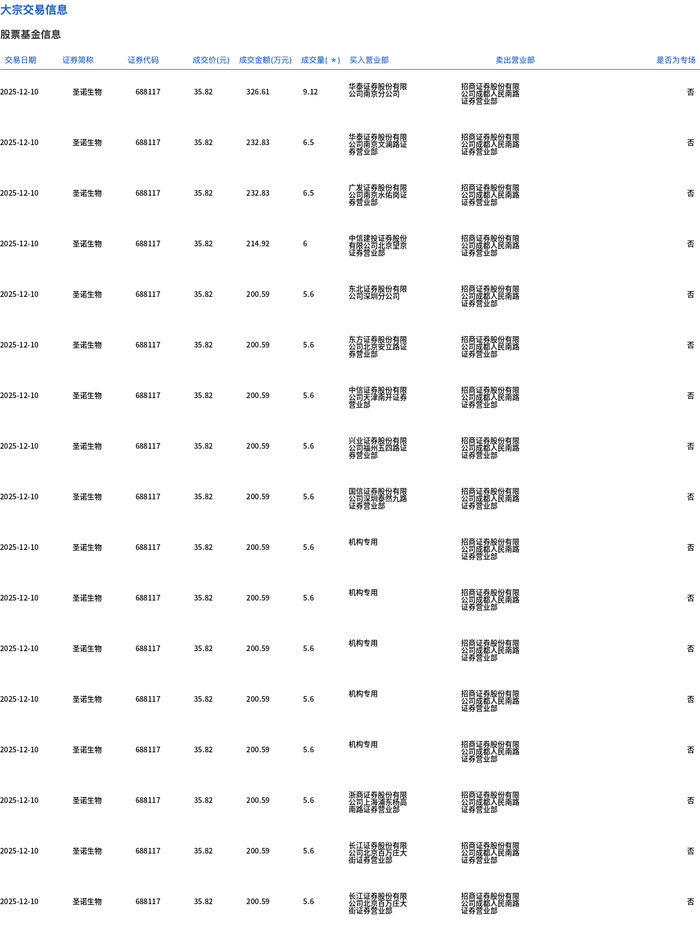 12月10日,圣诺生物大宗交易成交182.88万股,成交额6550.67万元,占当日总成交额的23.35%,成交价35.82元,较市场收盘价41.44元折价13.56%。