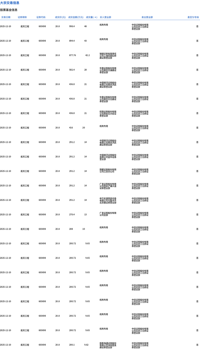12月10日,航天工程大宗交易成交414.37万股,成交额8618.9万元,占当日总成交额的5.9%,成交价20.8元,较市场收盘价24.25元折价14.23%。