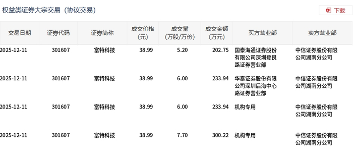 12月11日,富特科技大宗交易成交24.9万股,成交额970.85万元,占当日总成交额的12.56%,成交价38.99元,较市场收盘价42.61元折价8.5%。