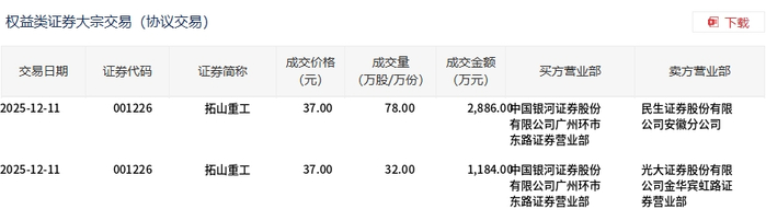 12月11日,拓山重工大宗交易成交110万股,成交额4070万元,占当日总成交额的29.87%,成交价37元,较市场收盘价41.25元折价10.3%。