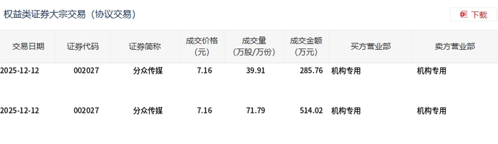 12月12日,分众传媒大宗交易成交111.7万股,成交额799.78万元,占当日总成交额的0.57%,成交价7.16元,较市场收盘价7.16元持平。