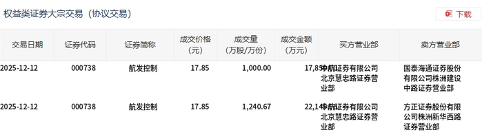 12月12日,航发控制大宗交易成交2240.67万股,成交额4亿元,占当日总成交额的53.16%,成交价17.85元,较市场收盘价19.51元折价8.51%。