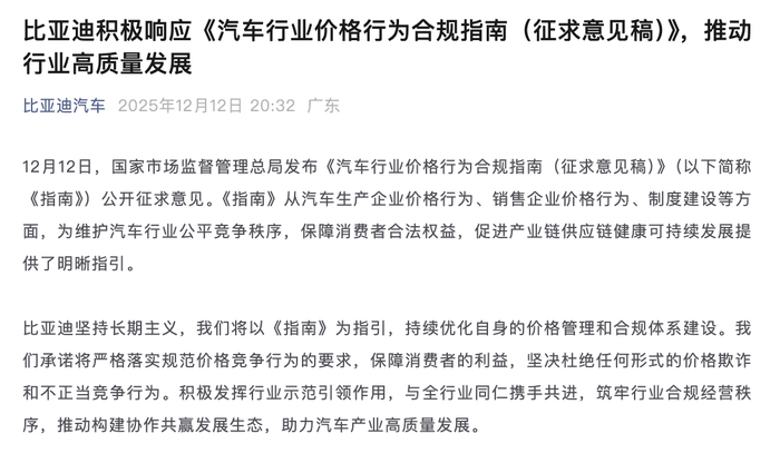 12月12日,国家市场监督管理总局发布《汽车行业价格行为合规指南(征求意见稿)》(下称《指南》)公开征求意见。当日晚间,比亚迪发文表示,将以《指南》为指引,持续优化自身的价格管理和合规体系建设。公司承诺将严格落实规范价格竞争行为的要求,保障消费者的利益,坚决杜绝任何形式的价格欺诈和不正当竞争行为。