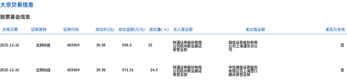 12月16日,北特科技大宗交易成交49.3万股,成交额1971.01万元,占当日总成交额的9.42%,成交价39.98元,较市场收盘价39.98元持平。