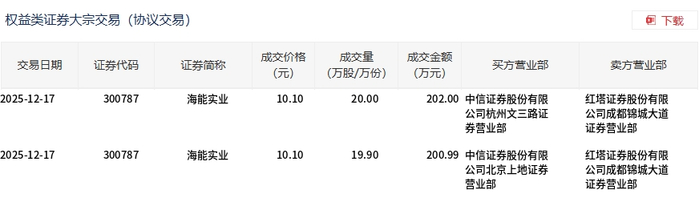 12月17日,海能实业大宗交易成交39.9万股,成交额402.99万元,占当日总成交额的7.17%,成交价10.1元,较市场收盘价11.15元折价9.42%。