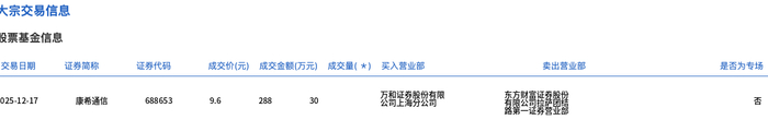 12月17日,康希通信大宗交易成交30万股,成交额288万元,占当日总成交额的3.47%,成交价9.6元,较市场收盘价11.99元折价19.93%。