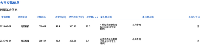 2月24日,南芯科技大宗交易成交30万股,成交额1272万元,占当日总成交额的4.2%,成交价42.4元,较市场收盘价42.83元折价1%。