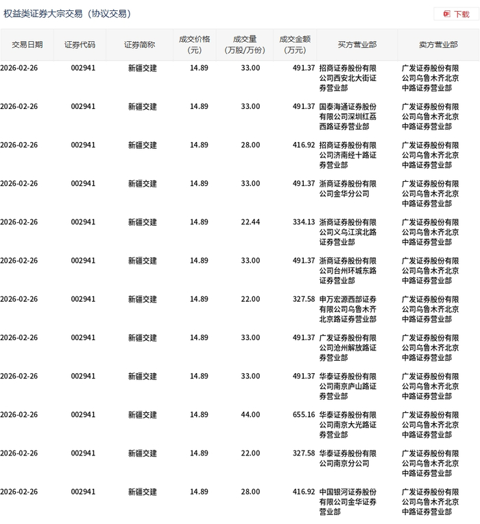 2月26日,新疆交建大宗交易成交364.44万股,成交额5426.51万元,占当日总成交额的21.17%,成交价14.89元,较市场收盘价16.47元折价9.59%。