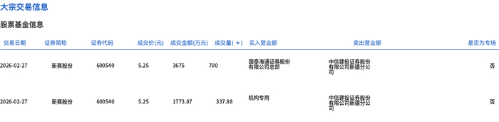 2月27日,新赛股份大宗交易成交1037.88万股,成交额5448.87万元,占当日总成交额的9.53%,成交价5.25元,较市场收盘价5.38元折价2.42%。