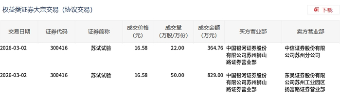 3月2日,苏试试验大宗交易成交72万股,成交额1193.76万元,占当日总成交额的2.99%,成交价16.58元,较市场收盘价18.15元折价8.65%。