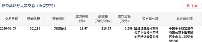 3月3日,万凯新材大宗交易成交216.53万股,成交额3999.31万元,占当日总成交额的14.94%,成交价18.47元,较市场收盘价20.5元折价9.9%。