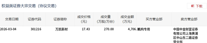 3月4日,万凯新材大宗交易成交270万股,成交额4706.1万元,占当日总成交额的22.93%,成交价17.43元,较市场收盘价20.28元折价14.05%。