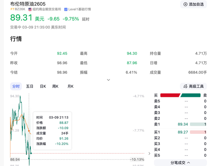 3月10日,全球原油市场上演剧烈震荡,短短一个交易日内,油价便从高位大幅回落,日内振幅超40%。在前一日创下史诗级暴涨、逼近每桶120美元高位后,国际原油期货价格在亚太交易时段上演断崖式跳水。截至发稿,伦敦布伦特原油期货主力合约盘中最大跌幅一度超过10%,自前一日高点119.5美元/桶急速回落至89美元下方;纽约商品交易所(NYMEX)的WTI原油期货同样重挫,盘中最低触及81.19美元/桶,较日内高点跌幅近30%。