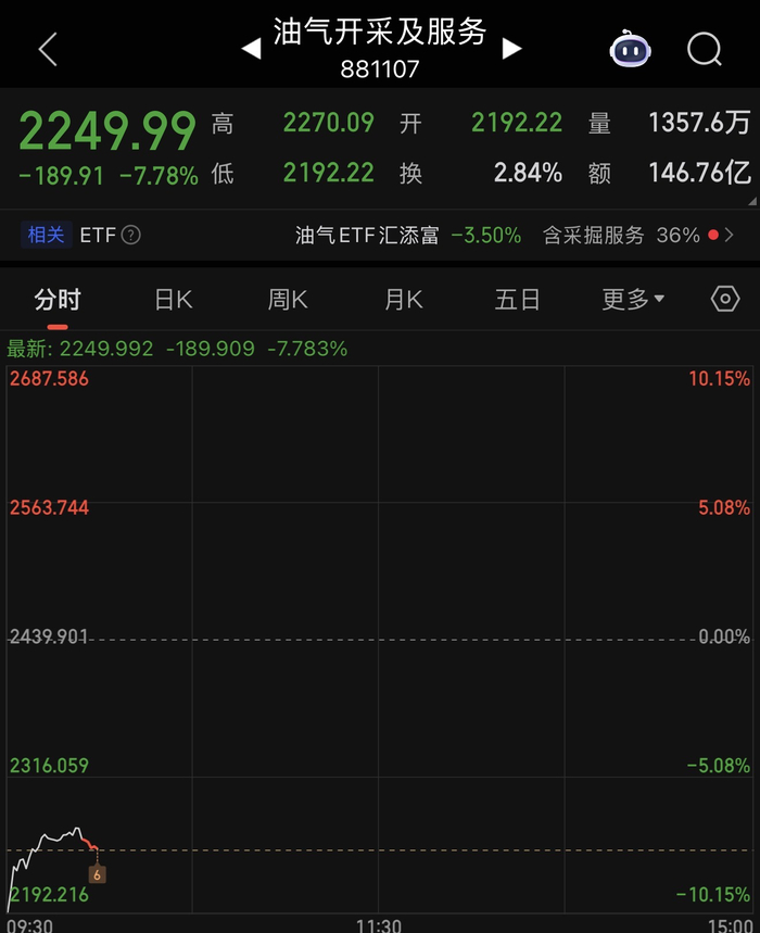 受此影响,A股油气板块同步遭遇重挫,今日早盘开盘油气股集体低开,洲际油气、山东墨龙、石化油服、准油股份等多只个股跌停,通源石油、科力股份、特瑞斯、潜能恒信等低开超10%,板块整体大幅回调。
