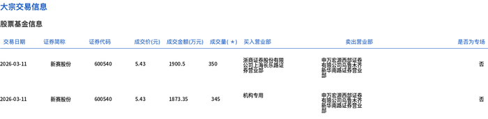 3月11日,新赛股份大宗交易成交695万股,成交额3773.85万元,占当日总成交额的14.18%,成交价5.43元,较市场收盘价5.51元折价1.45%。