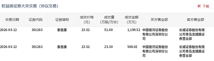 3月12日,泰恩康大宗交易成交74.3万股,成交额1747.54万元,占当日总成交额的12.22%,成交价23.52元,较市场收盘价28.8元折价18.33%。