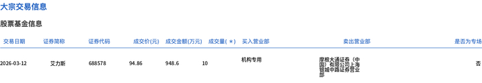 3月12日,艾力斯大宗交易成交10万股,成交额948.6万元,占当日总成交额的3.22%,成交价94.86元,较市场收盘价94.86元持平。