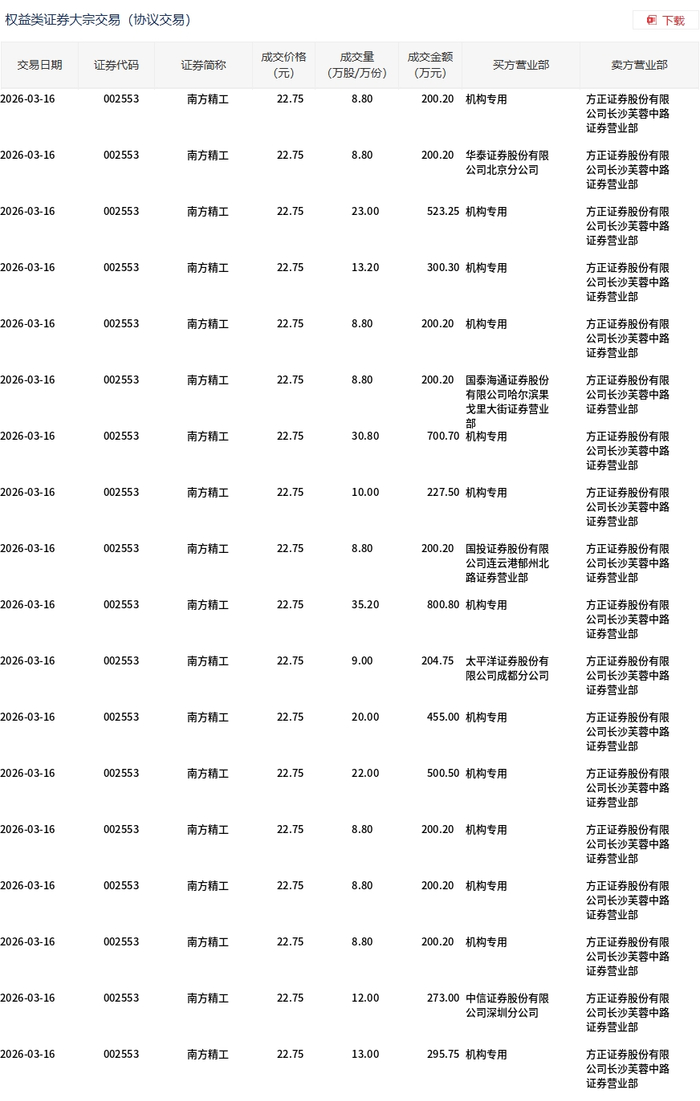 3月16日,南方精工大宗交易成交258.6万股,成交额5883.15万元,占当日总成交额的26.54%,成交价22.75元,较市场收盘价25.47元折价10.68%。