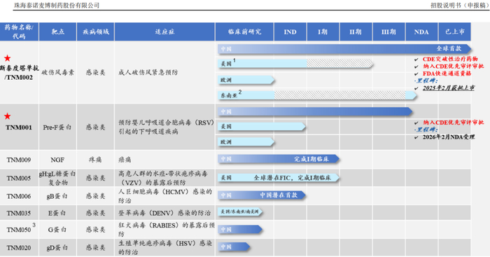 公司旗下全球同类首创的斯泰度塔单抗注射液(即“重组抗破伤风毒素全人源单克隆抗体TNM002”,商品名:新替妥®)已上市,TNM001(抗呼吸道合胞病毒RSV单抗)已在中国提交NDA(药品上市许可申请)并获受理,2款候选药物TNM009(抗神经生长因子NGF单抗)及TNM005(抗水痘-带状疱疹病毒VZV单抗)已完成临床I期试验,1款候选药物TNM006(抗人巨细胞病毒HCMV单抗)已获批IND(新药研究申请),以及3款候选药物处于临床前阶段。