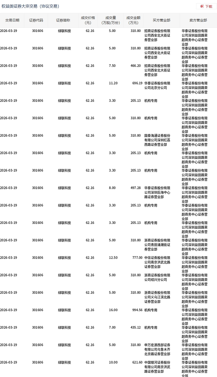 3月19日,绿联科技大宗交易成交186.5万股,成交额1.16亿元,占当日总成交额的18.62%,成交价62.16元,较市场收盘价70.64元折价12%。