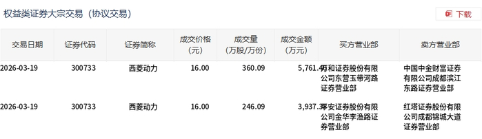 3月19日,西菱动力大宗交易成交606.18万股,成交额9698.78万元,占当日总成交额的56.44%,成交价16元,较市场收盘价17.13元折价6.6%。