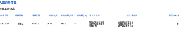 3月19日,新通联大宗交易成交85万股,成交额889.1万元,占当日总成交额的16.41%,成交价10.46元,较市场收盘价10.9元折价4.04%。